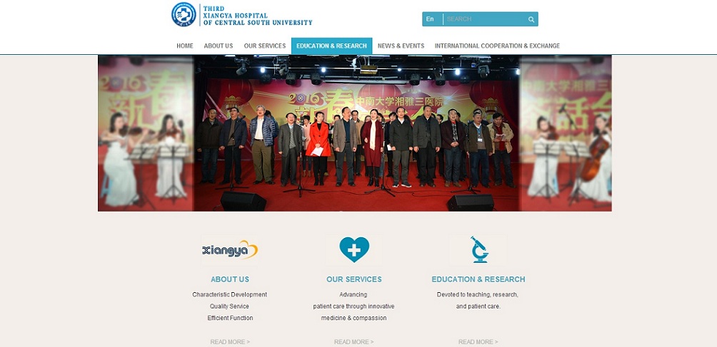 湘雅三医院英文网站于近日顺利通过测试,完成改版升级,全新上线。新版英文网站域名为en.xy3yy.com,从医院中文网页点击English可直接进入。网站设置5大板块,23个子栏目,从About us(医院概况),Our Services(临床、医技、护理服务,专家介绍等), Education &Research (教学与科研),News &Upcoming Events(新闻动态),International Cooperation& Exchange(国际合作与交流)五个方面全面展示医院形象和实力,成为我院进一步扩大国际影响力和品牌知名度,更好实施 “走出去、请进来”战略的新平台、新窗口。