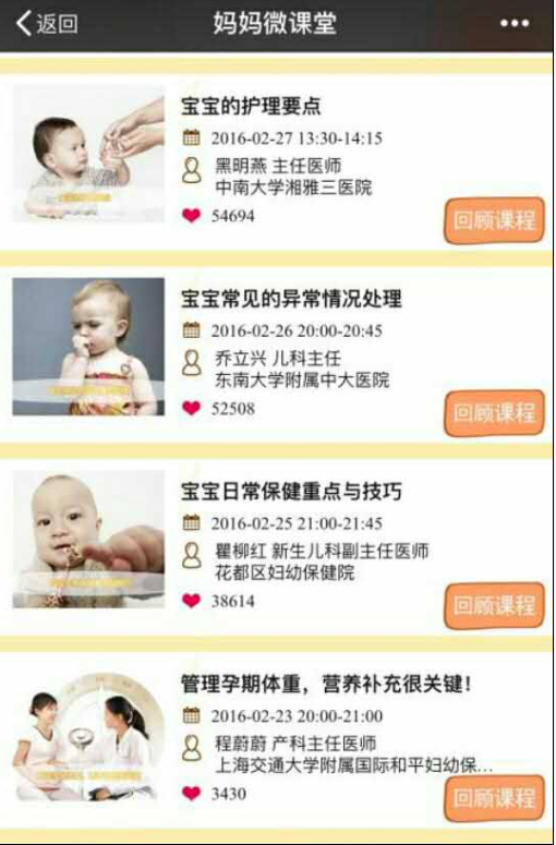 2月27日,儿科黑明燕教授受“惠氏妈妈微课堂”之邀,在线一对一实时为各位准妈妈答疑解惑并进行“宝宝的护理要点”讲课,获得广大家庭的喜爱,并获54694点击量,排名第一。