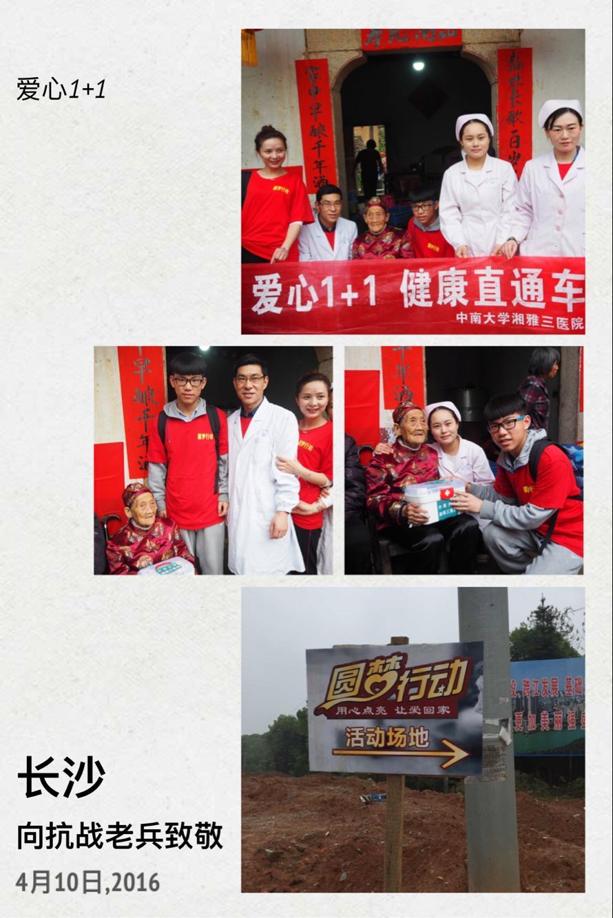 4月10日,湘雅三医院“爱心1+1健康直通车”志愿者小组开车前往黑麋峰,慰问抗战老兵遗孀周张华老人。