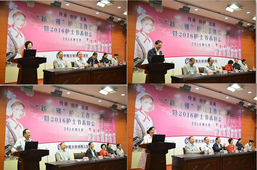 护理部丁四清主任以“传承老湘雅优良传统,打造新湘雅护理品牌”为主题,进行了“十二五”护理总结和“十三五”护理规划报告。“十二五”期间,在各级领导重视、兄弟科室支持下,我院护理队伍快速发展。目前护理人员硕士及以上学历占10%,本科以上学历占80.3%,远高于全国平均水平(14%);高级职称护士增加20人,博导新增1人、硕导新增6人;培养贾氏学者3人。中华护理学会委员和专家库成员从0增加到12人;湖南省护理学会主任委员挂靠单位由1个增加至5个,副主任委员由4人增加至14人,委员增加20人,并进入了湖南省护理学会副理事长单位。2012年获得卫生部第一批“优质护理服务示范病房”和卫生厅首批“优质护理服务先进单位”;2013年获得“国家临床护理重点专科建设项目”;2014年获得“国家自然科学基金”和“国家留学基金委项目”;2015年又添“国家自然科学青年基金”1项,实现了湖南省临床护士国自项目零的突破。“十三五”期间将着力队伍发展与学科建设;保障质量安全与优质服务;打造“新湘雅”护理特色和品牌。
