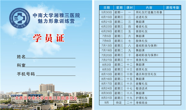 魅力形象训练营由院团委面向全院青年开设,共设着装、面部、肢体、商务、护理、彩妆等20节形式多样、内容丰富的礼仪课、形体课。课程结束后,青年们将在第五届青年文化艺术节进行礼仪风采集中展示,医院还将选取二十名精英成立礼仪队。
