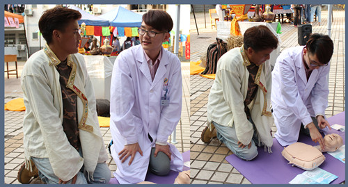 第一站宣教组的同学来到升华广场,向同学们宣教心肺复苏这项急救技术重要性和在我们国家普及的紧迫性。及时、正确地实施CPR帮助心脏停搏的人恢复呼吸与心跳,可有效提高这类病人的存活率,而且可避免严重后遗症。