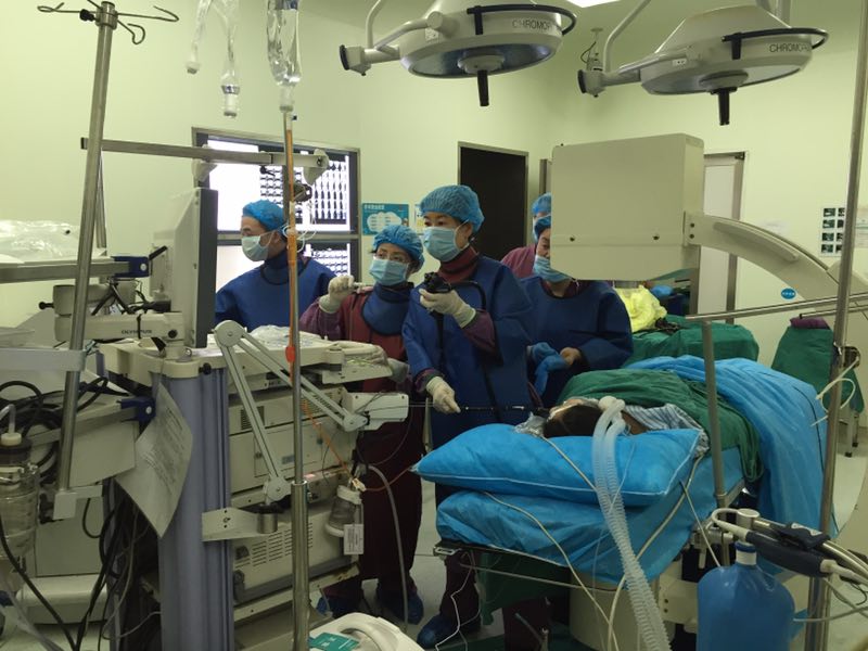我院消化内科作为“湖南省医学会消化内镜学专业委员会超声内镜学组”的组长单位,在王晓艳主任的带领下,消化内科超声内镜团队自2012年在省内率先开展超声内镜引导下胰腺假性囊肿金属支架内引流术,胆管胰管引流技术、腹腔神经节阻止术、增强造、EUS、I125粒子植入、无水乙醇及药物注射术等微创介入技术,每年完成完成EUS-FNA及各种微创介入治疗病例300余,手术成功率100%,无一例出现严重并发症,我院假性囊肿引流的手术视频荣登2016年美国消化系病周(DDW)向国内外医师展播。