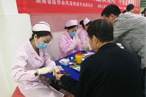 4月20日,由湖南省风湿病专业委员会、中南大学湘雅三医院肾内科、第一党总支肾内科党支部组织的“4.20全民关注痛风日”义诊及健康教育活动在岳麓区咸嘉湖社区卫生服务中心举行。义诊活动由肾病风湿科筹划,义诊队伍由院第一党总支部书记郑乐知和肾病风湿科副主任桂明带领,胡静医师、吴琼英护士长及其护理团队参与。