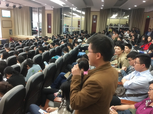 黄进华副院长开场致辞后,来自湘雅三医院肿瘤内科的副研究员曹科首先与同学们分享了他自己的科研经验,他用"变态"二字形容了自己的日本留学之旅,并告诫同学们应当向日本人学习他们严谨的工作态度,契而不舍的工作作风,曹科副研究员幽默风趣的语言使观众不时发出欢乐的笑声并报以热烈的掌声。而来自湘雅三医院心内科的科研女神蔡菁菁副研究员则与同学们介绍了自己研究的大数据与人工智能在大数据时代应用于广阔前景,并声情并茂地给大家讲述了一个感人的故事——在她行医路上,因为一位年轻病毒性心肌炎患者的逝世,击碎了一个幸福美满的新婚家庭,给家人带来无比的沉痛。这让她更加坚定了探究心血管疾病的发病机制的决心,让她更热衷于自己的科研事业。压轴出场的是湘雅三医院血液内科大牛吕奔研究员,他用一个“四分三十秒”征服了自己国外导师的精彩故事,告诉大家要从容自信,用积极的心态和不懈的努力来面对生活学习中的种种挑战,赢得了大家热烈的掌声,同时向同学们提出除校训外应当铭记另外四点——“创新、感恩、宽容、开心”。