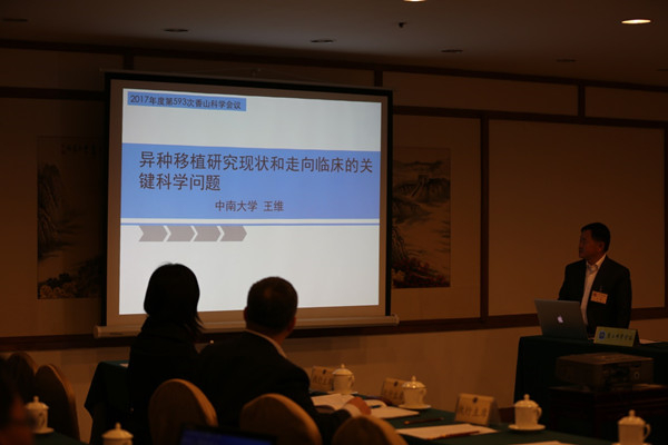 4月19日-20日,第593次香山科学会议在北京香山饭店召开,主题为“异种移植走向临床研究的关键科学问题”。来自科研院所、高校、国家科研管理机构等近40个单位的异种移植相关免疫学、病毒学、动物遗传学、生物学、临床医学等领域相关顶级科技工作者、科技管理人员等有关部门代表共40人参加了会议,13位专家学者做了大会专题报告。湖南省异种移植工程中心主任王维教授担任此次会议申请人、第一执行主席,在大会作了时长50分钟的主题述评报告。