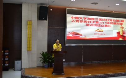 6月17日,湘雅三医院分党校第六期入党积极分子暨2017年发展对象培训班结业典礼在湖南省党史陈列馆举行。分党校校长、医院党委书记罗爱静,分党校副校长、医院党委副书记、纪委书记吴希林,医院特邀党建组织员郑兰香同志出席结业典礼。各党总支书记、党办、团委、全体学员参加结业典礼。结业典礼由党委办公室主任陈亚南主持。