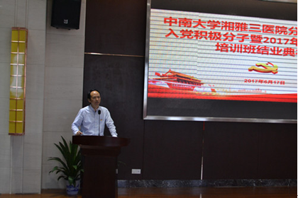 分党校副校长、医院党委副书记、纪委书记吴希林作培训班工作总结,他指出本期培训班具有三大特色:一是从严从实加强党建。学员的资格审查从党支部到党总支再到党委,逐级把关,认真核实,坚持慎重发展,均衡发展,成熟一个,发展一个,始终抓好细节,把牢关口;二是严格学员考勤。分党校要求学员在集中授课前20分钟签到,做好课前准备。在考勤中,积极分子集中授课28名学员全勤,缺勤2名学员均在其他分党校补课。21名发展对象集中授课全部全勤;三是加强社会实践。分党校将学员列入医院 “爱心门诊”志愿服务队,组织参加志愿服务活动。通过志愿服务活动端正入党动机,引导和激励学员践行全心全意为人民服务的宗旨。同时,他也指出分党校存在的问题,并提出了建设性指导意见:一是要完善制度,加强学员管理;二是要创新培养方式,依托新湘雅新媒体平台,提高培训实效;三是要引导和激励临床一线、中青年骨干和“双高”人员积极向党组织靠拢。