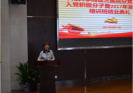 党课结束后, 分党校校长、党委书记罗爱静作总结讲话。罗书记首先对各位学员的顺利结业表示祝贺,高度肯定了本期培训班取得成绩。她强调本期培训班培训形式新颖,课程内容丰富,学员克服困难,积极上进,取得优异成绩。她认为医院发展成果来之不易,这得益于历届党委的坚强领导,得益于充分发挥党员的先进模范和党支部的战斗堡垒作用。在讲话中,罗书记对全体学员提出三点要求:一是要坚守共产主义理想信念,矢志不渝,为党奋斗终生。她指出中国共产党在历史的关键时期,始终坚定理想信念,发挥领导核心作用,解放中国,实现民族独立,改革开放,实现民族富强,在新时期,带领中国人民为实现“中国梦”而奋斗;二是要坚持用马列主义武装头脑,学无止境,提高理论修养。她要求每位学员都要学原文,读原著,悟原理,学习党的基本理论知识,学习习近平总书记系列讲话,掀起读书热潮,做到学无止境,进而推动“两学一做”学习教育常态化制度化;三是坚持理论联系实际,脚踏实地,努力争先创优。她用医院援塞拉利昂医疗队李守根的先进事迹激励大家,要脚踏实地,团结奋进,立足岗位做好本职工作,发挥模范带头作用,为医院发展和学校“双一流”建设贡献力量。