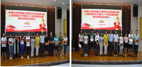 经综合考核,本期入党积极分子30名学员顺利结业,分党校颁发结业证书,其中感染科副主任张磐被评为中南大学党校优秀学员标兵,第十(后勤)党总支杨厂锋、欧阳威、第十一(学生)党总支王浩3人被评为中南大学党校优秀学员。张磐以《不忘初心 坚守本色》为题作了学习汇报,她说:“入党意味着追逐一个理想,承担一个责任,允诺一份忠诚。”她认为作为一名积极分子,要树立共产主义伟大理想信念,要坚守住中国共产党人的精神家园,矢志不渝地秉承党的优良作风,对党忠诚,积极工作,在平凡的岗位中让自己的生命变得更有价值。
