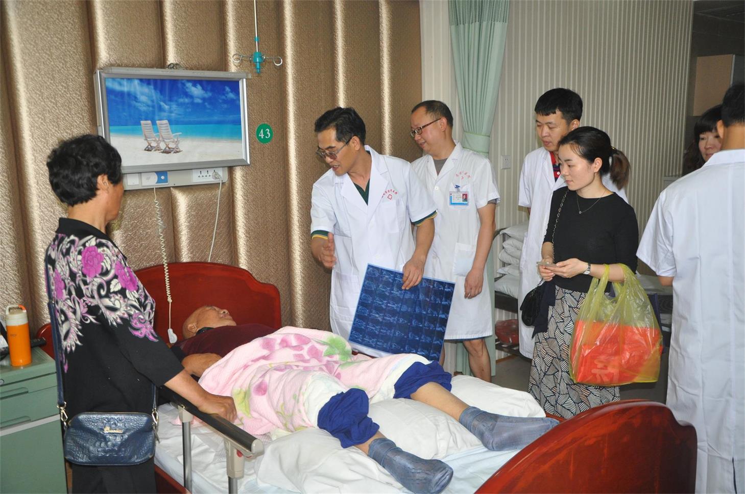 党员们在何乐业教授的带领下进行了医疗查房、慰问伤残军人,并针对性的就伤残军人们的诊断和治疗提出了相关建议。慰问中,其中有一位伤残军人袁老先生,湖南邵阳人氏,20多岁就被炸弹炸伤,膀胱憩室并结石,前列腺增生,高位截瘫已30多年,长期留置导尿管,间歇血尿5天,何教授详细询问了老先生的病情,为他做了详细的身体,对他们敢于牺牲自己、无私奉献的精神和高尚的情操表示十分敬佩。在他的病床前一直站着一位老娭毑,她是袁老先生的夫人,据荣军医院院领导介绍,他们是在袁老先生被炸弹炸伤了之后才结婚领养小孩,这么多年来,一直不离不弃。 查房结束后,何乐业教授为该病人免费进行了手术,并顺利的在内镜下完成了膀胱碎石取石手术。