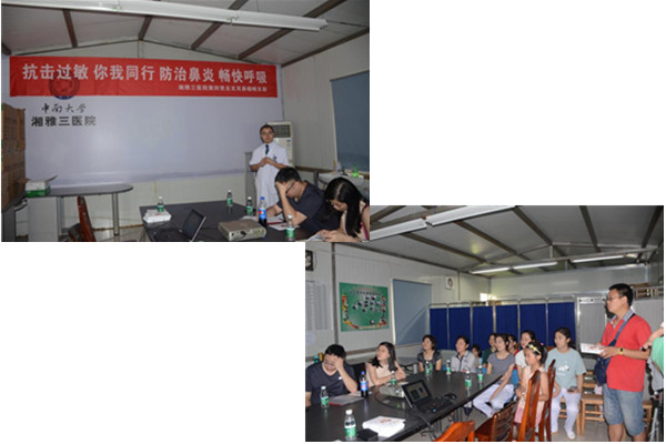 同时,张晓伟博士正在进行着“过敏性鼻炎”的科普讲座活动,到场的患者从几岁到几十岁不等,年龄跨度之大,每一位都倾听地异常认真。张晓伟博士以专业的理论知识结合自身丰富的临床经验,首先为患者们讲解了什么是“过敏性鼻炎”,它的典型症状,以及如何分辨“过敏性鼻炎”与感冒的知识;深入讲解了“过敏性鼻炎”的原因,以及“四位一体”的过敏症治疗方案。张晓伟博士介绍到,如果“过敏性鼻炎”长期得不到治疗或单纯使用消炎药,会有发展成为哮喘的危险,而且患鼻息肉、鼻窦炎及分泌性中耳炎的可能性将大大增加,最后还倡导把“小鼻子——大问题”通过科学的治疗转变成为“小鼻子——大健康”。