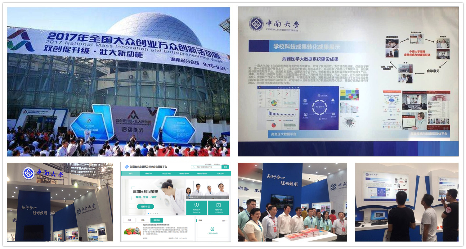 9月15日-21日,湖南省举行2017年全国大众创业万众创新活动周湖南省分会场有关活动(以下简称“双创”),中南大学湘雅三医院高血压大数据平台作为中南大学展厅的重要部分,作为唯一大数据医疗科研应用平台在大会上进行了图文并茂以及视频播放的示范展示。