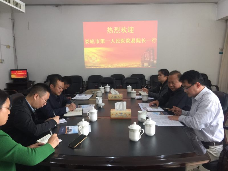 娄底市第一人民医院一行4人,由院长易军波带队,来院共同探讨医联体建设及相关工作。湘雅三医院副院长黄飞舟,社会服务部主任赵颜忠、副主任佘彩婷参加了座谈。易院长对医院的热情接待表示感谢,并介绍了娄底市第一人民医院的基本情况和发展方向,谈了对医联体建设的感慨和体会,对湘雅三医院医联体实践模式,尤其是移动远程医疗平台给予了高度认同和赞赏。黄飞舟副院长对来访表示欢迎,并介绍了医院的基本情况。随后双方针对医联体建设和下一步精准帮扶工作进行了深入的交流和探讨,并达成了初步共识。