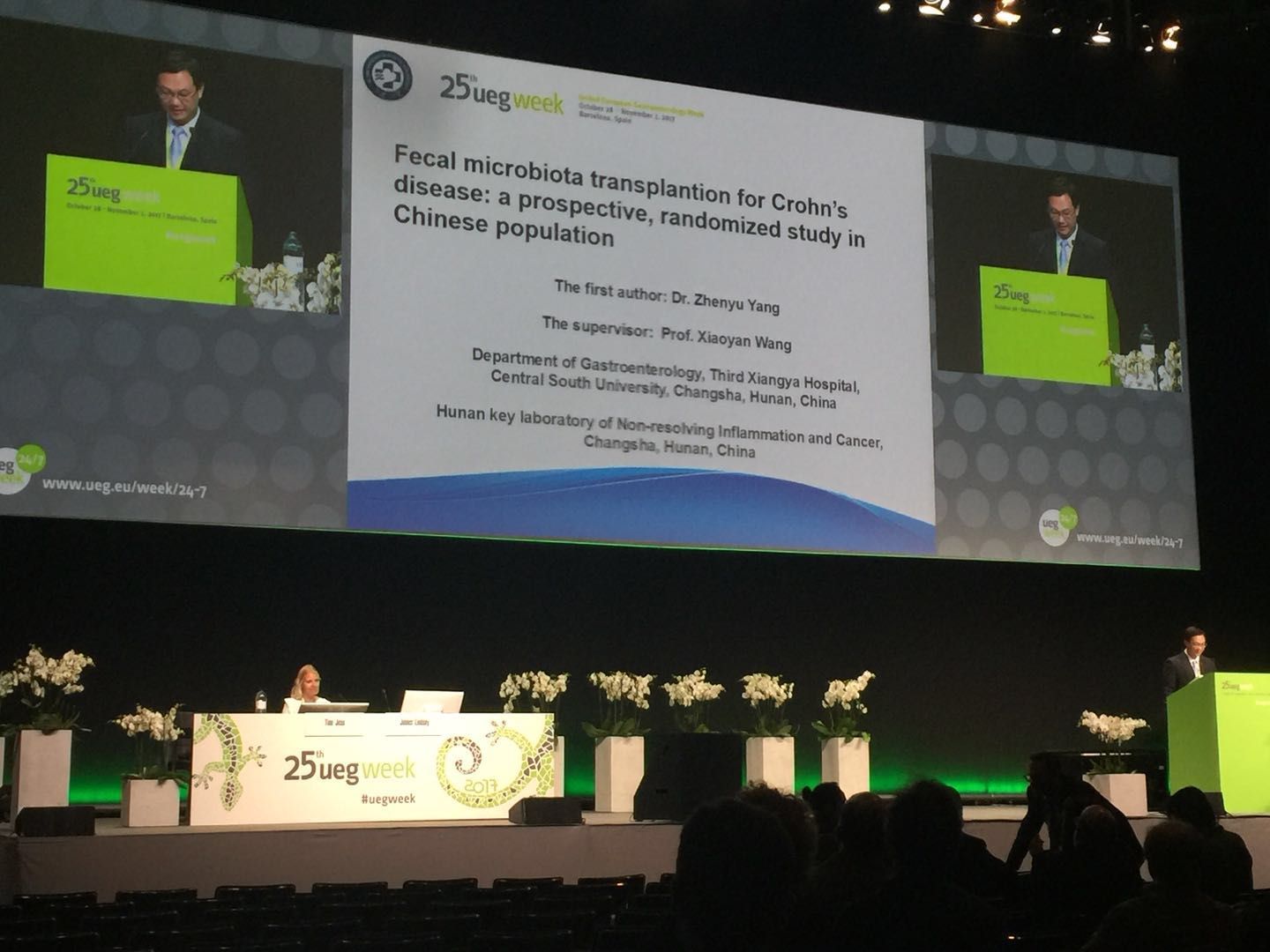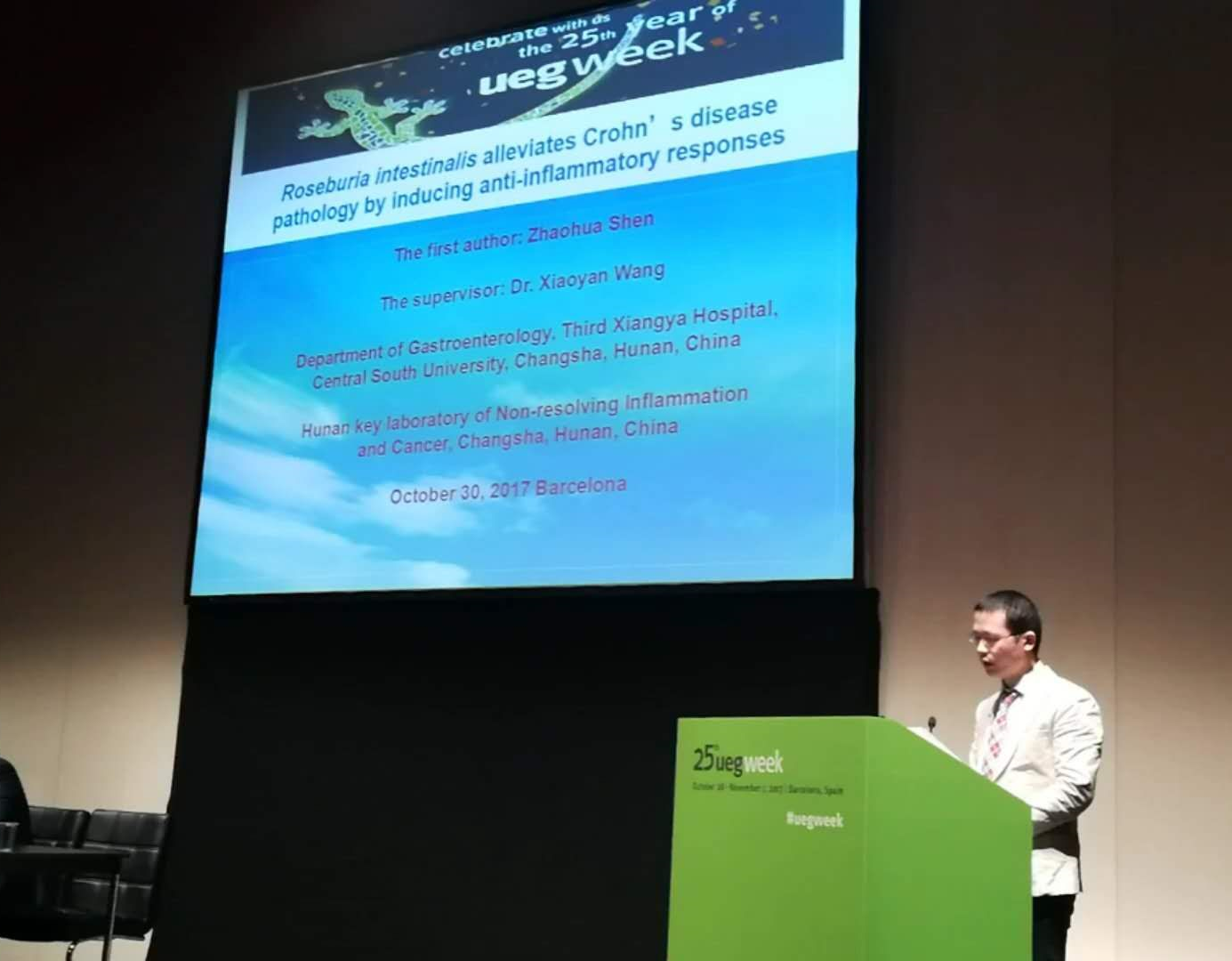 本磁次UEGW在西班牙巴塞罗那举行,是欧洲规模最大、最具有影响力的消化大会,每年吸引来自全球超过10000多名医师与学者参加。会上,王晓艳教授课题组杨振誉医师和沈照华博士就炎症性肠病中的肠道菌群的变化特征、粪菌移植在炎症性肠病中的作用及其抗炎保护机制,进行了口头报告和深度交流,受到国内外同行的广发关注。同时,消化内科还有多篇壁报也吸引参会者驻足关注。