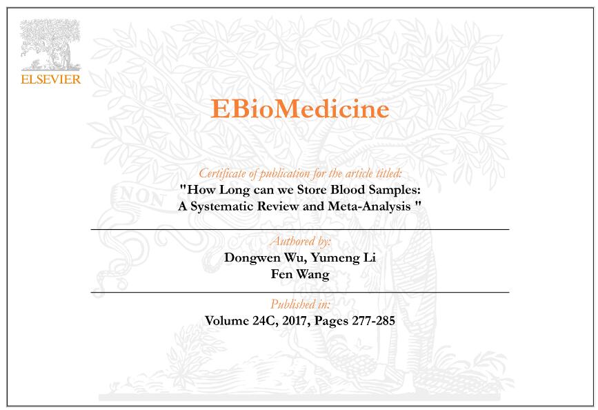 近日,中南大学湘雅三医院2012级八年制学生吴栋文、李雨萌在消化内科王芬教授指导下撰写的论文《How long can we store blood samples: A systematic review and meta-analysis》在国际顶级期刊《EBioMedicine》正式发表。