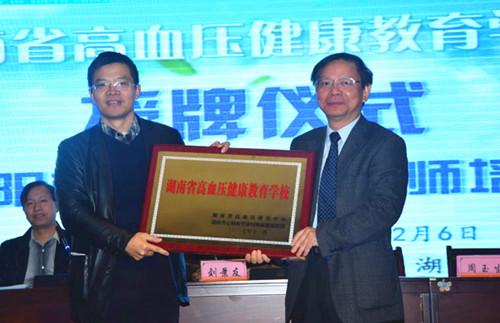 湖南省高血压健康教育学校校长袁洪向南华附二分校校长曾高峰授予了“湖南省高血压健康教育学校”校牌。