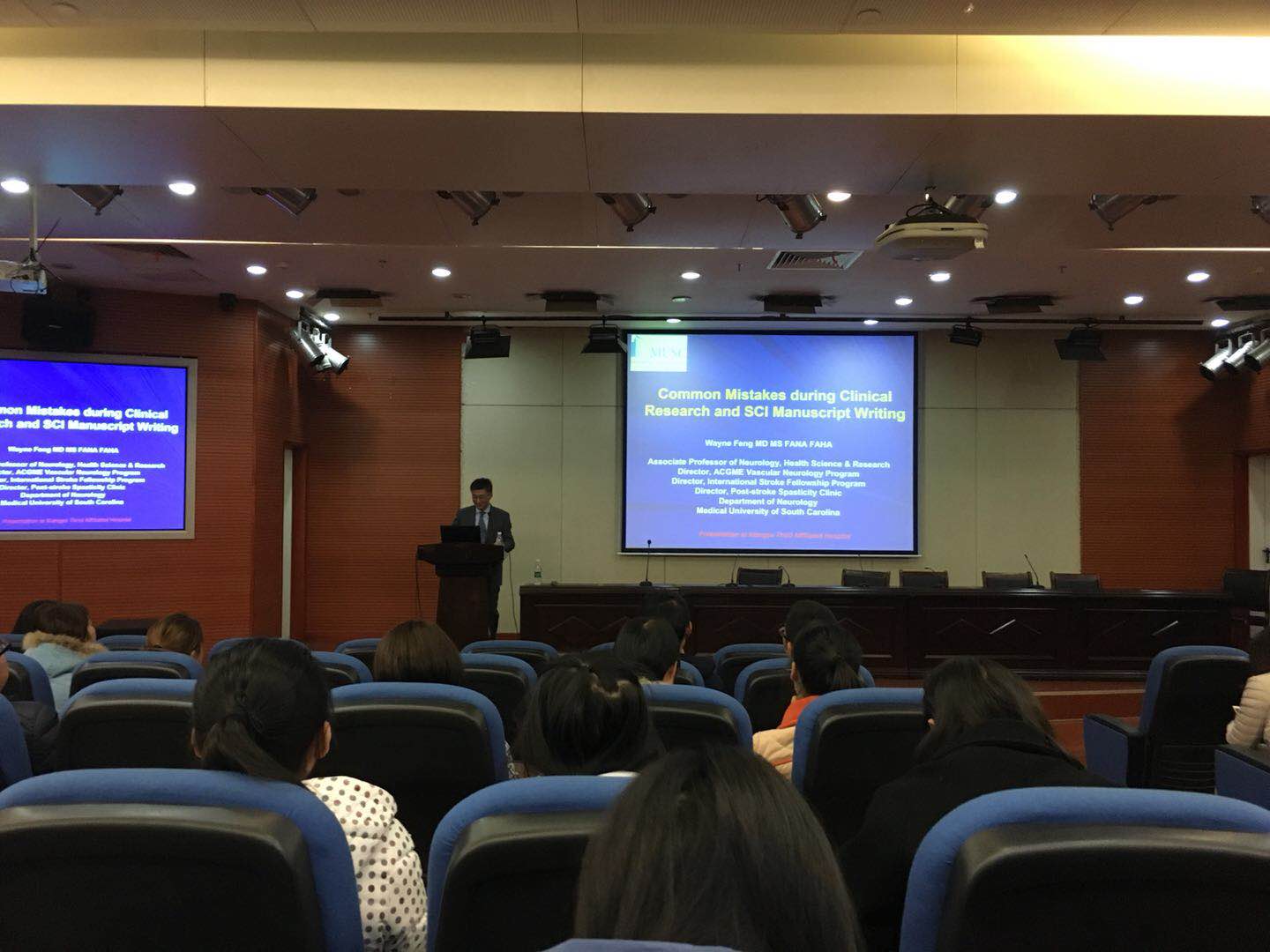 12月6日晚,美国南卡罗莱纳医科大学中风康复中心研究员、国际中风培训项目主任冯武威受邀在外科楼二楼学术报告厅进行学术报告。本次学术报告由康复医学科主办,康复医学科主任李旭红主持,众多专家及科研人员、康复医学科全体医务人员参与本次学术报告会。
