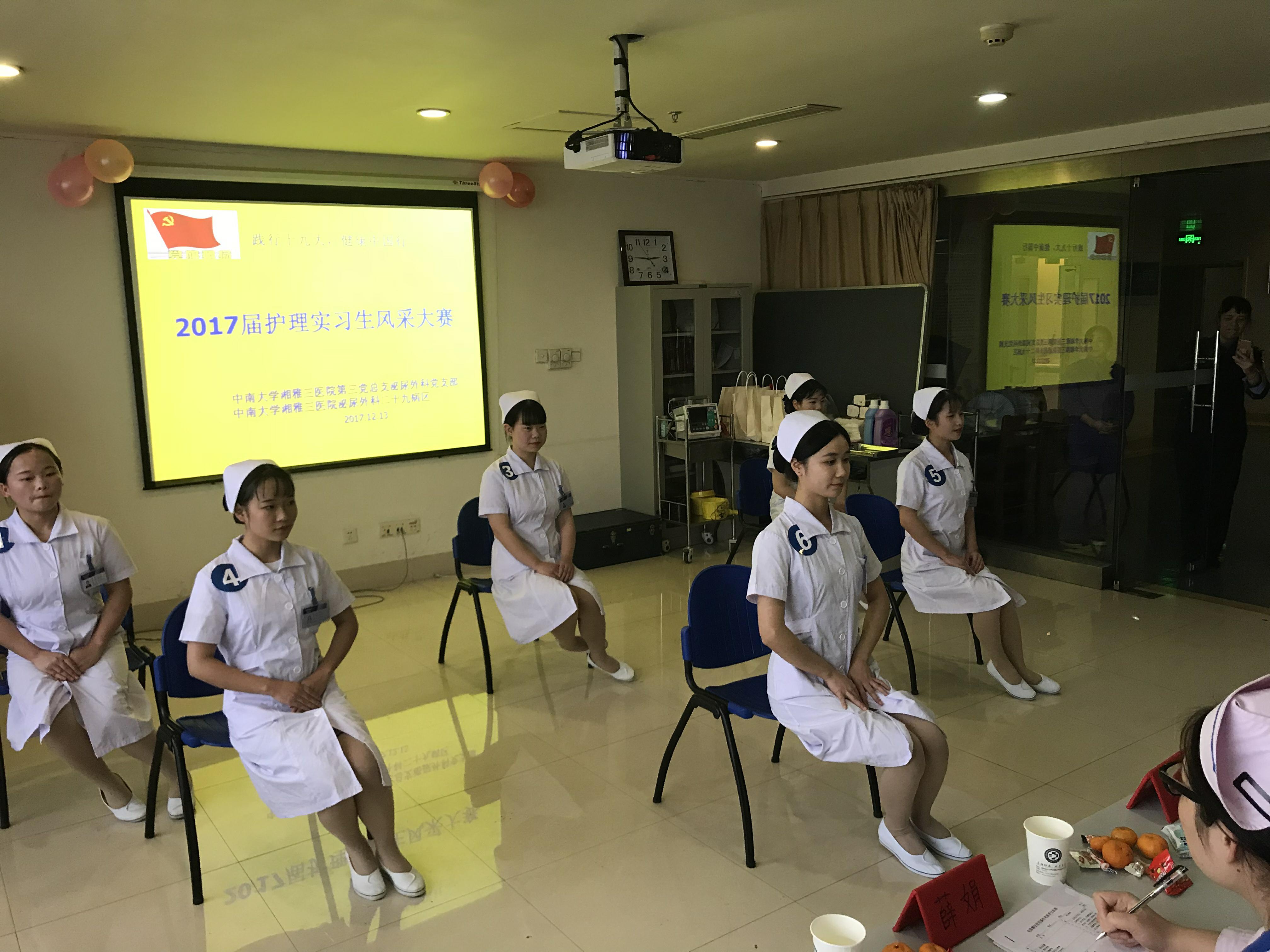 12月13日下午,中南大学湘雅三医院第三党总支书记方俏茜和护理教研室主任毛平组织第三党总支泌尿外科党支部开展了“2017届护理实习生风采大赛”教学活动。活动本着寓教于乐的宗旨,提升护理实习生的实践能力,营造良好的教与学的氛围,展现护理专业学生的礼仪风采。