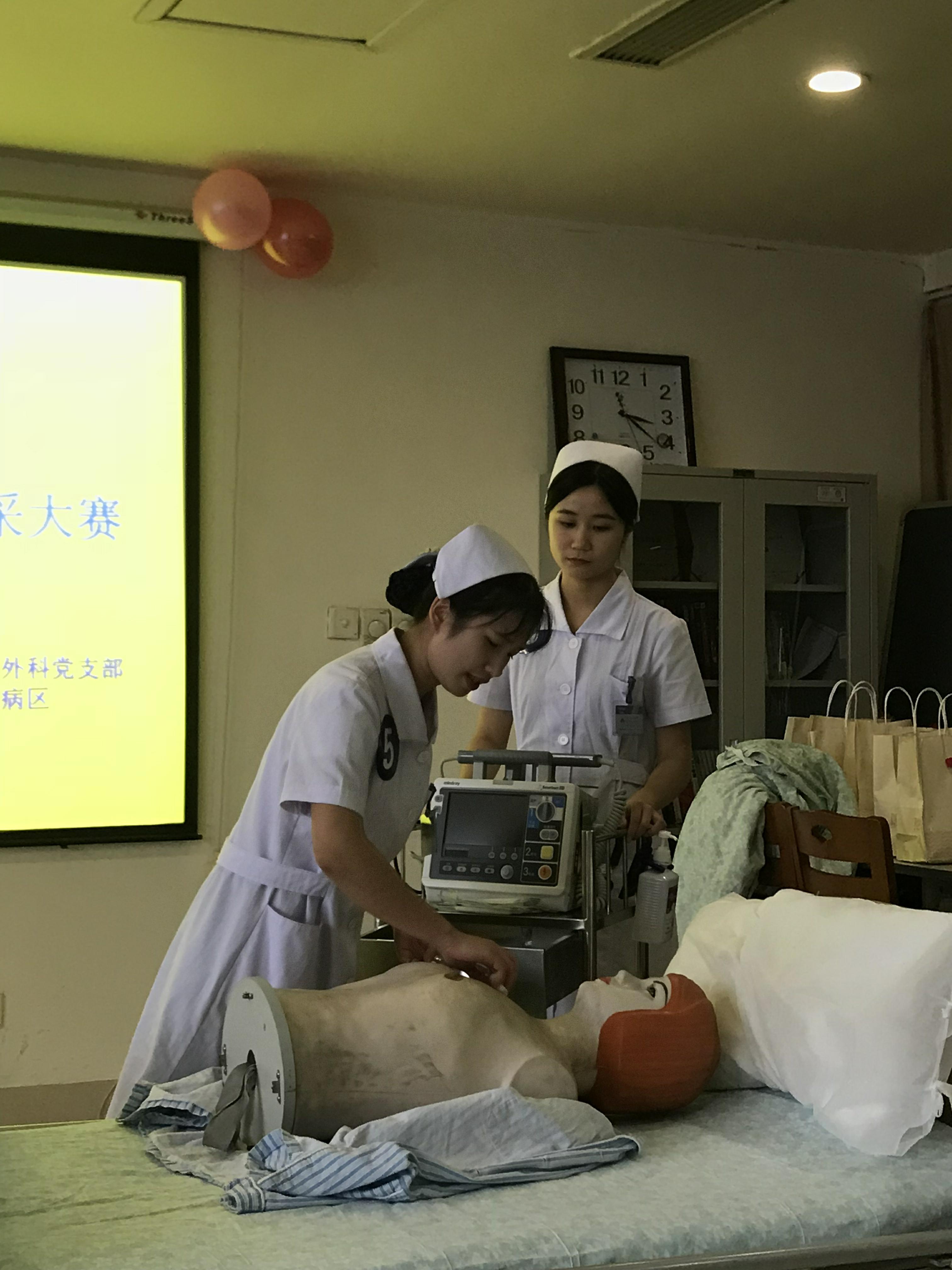 活动在外科楼15楼示教室举行。担任此次比赛的评委有泌尿外科医师阳建福副教授,薛娟护士长、蒋芳总带教等,活动还邀请了泌尿外科全体病友家属参加。活动共分为三个环节:护士基本礼仪和才艺展示、电除颤仪的操作比赛以及心肺复苏术的现场指导。