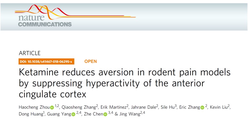 近日,国际知名期刊《自然-通讯》(Nature Communications,IF=12.353)在线发表了中南大学湘雅三医院黄东教授研究团队的最新研究成果“Ketamine reduces aversion in rodent pain models by suppressing hyperactivity of the anterior cingulate cortex”(2018-09-14 , DOI: 10.1038/s41467-018-06295-x)。论文第一作者是我校2015级博士研究生周浩宬,中南大学湘雅三医院为第一单位,该论文在湘雅三医院黄东教授和美国Jing Wang教授合作指导下完成。