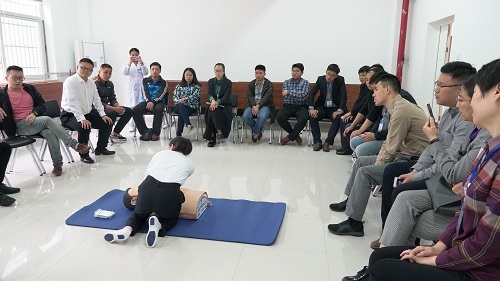 李守根从案例入手,对如何正确拨打120、心肺复苏、气道异物梗阻、溺水等急救基础知识进行了深入浅出的讲解。之后培训老师们情境模拟演示了心肺复苏和异物梗阻正确的施救方法——“海姆立克急救法”。