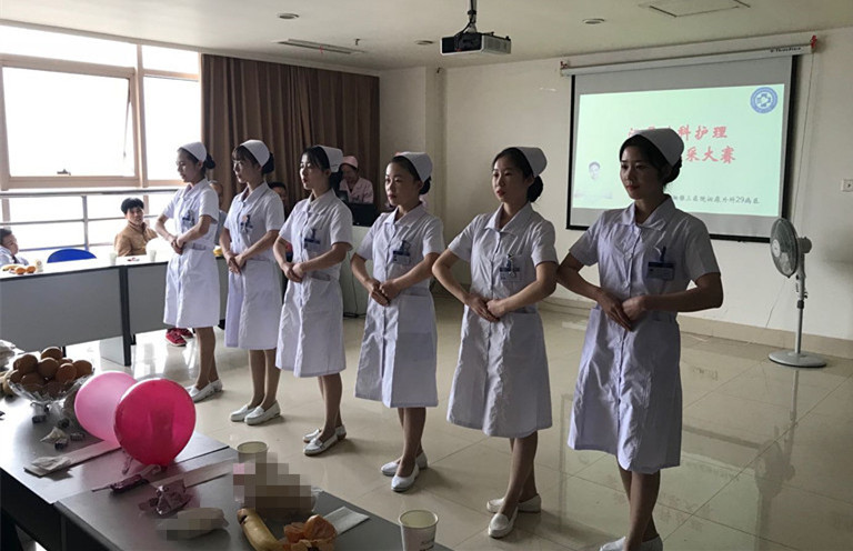在美妙的旋律中,这些身穿整齐服装的泌尿外科护理实习生们迈着轻盈矫健的步伐走来。护生们为她们的特殊评委——病友们呈现了一场专业的护理礼仪风采。她们在不同的场景中展示了护士站姿、坐姿、行走等基本礼仪及托治疗盘、推治疗车、持病历本等护士职业礼仪,展现了护生们优美的仪表、优雅的举止,病友们通过气球对心仪的选手们进行投票,气氛非常活跃。