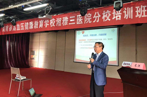 10月24日上午,中南大学湘雅三医院健康中心六楼,湖南省高血压健康教育学校校长、湘雅三医院袁洪教授和心内科主任蒋卫红教授正在给几十名省直机关离退休的老同志讲一堂高血压知识防治的科普课。
