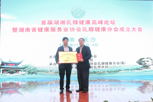 11月3——4日,“首届湖湘乳腺健康高峰论坛暨湖南省健康服务业协会乳腺健康分会成立大会”在长沙召开。湖南省健康服务业协会乳腺健康分会挂靠中南大学湘雅三医院,该院乳甲外科主任钱立元教授当选湖南省健康服务业协会乳腺健康分会第一届理事会理事长。