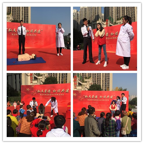 11月28日上午,岳麓区银盆岭街道银星社区在绿地中央广场开展题为“弘文崇德 和谐共建”的党建结对共建活动,湘雅三医院作为社区结对共建单位应邀前往。由第十二党总支(离退休)牵头,第七党总支(门急诊)和第十一党总支(学生)共同组成“老中青”共10人义诊团队,为银星社区居民开展义诊和心肺复苏演示教学。新华社湖南分社、湖南日报长沙分社、市直机关等12家单位,近300名居民参加此活动。