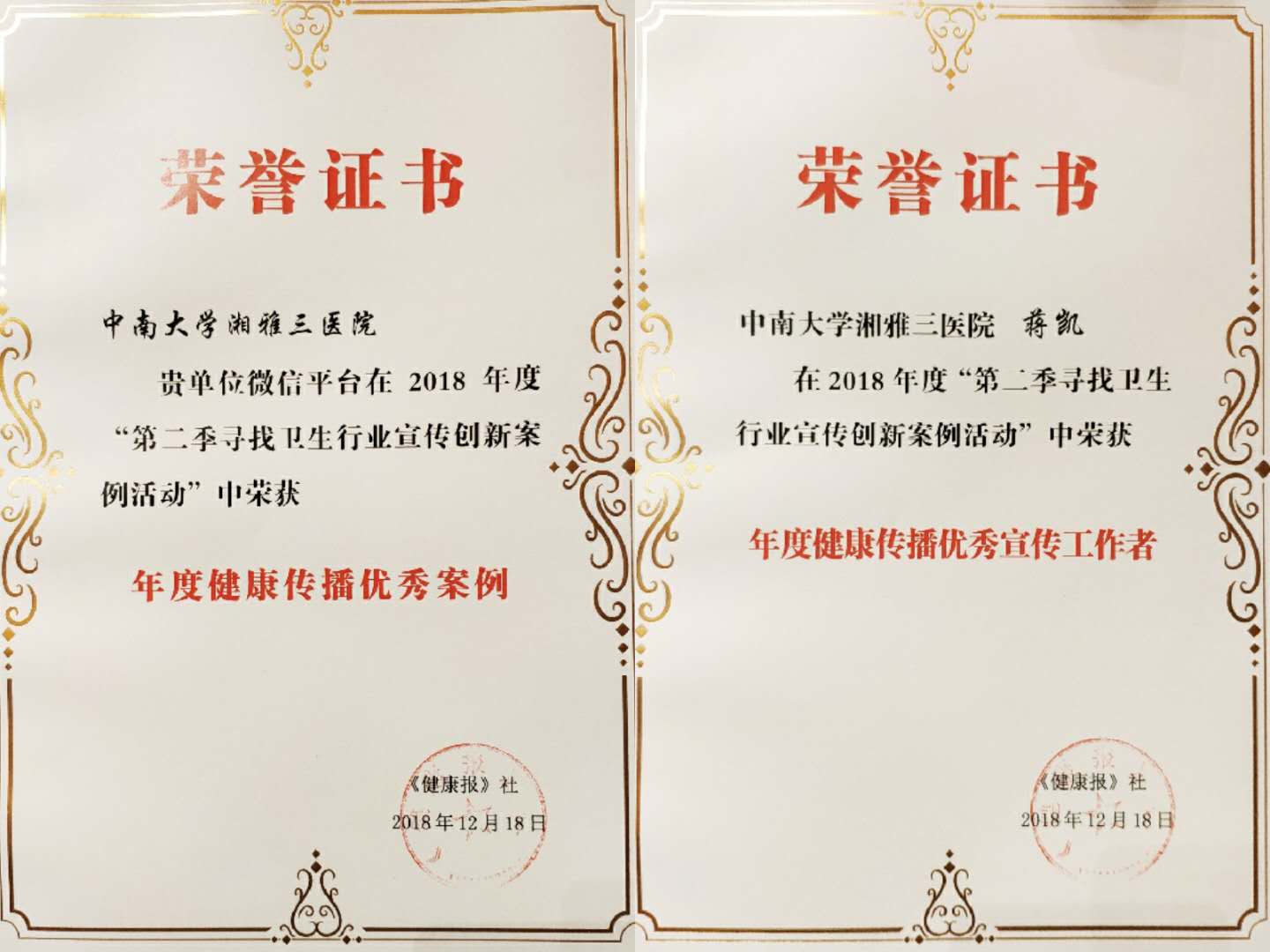 2018年12月28日,全国卫生健康行业宣传年会在四川德阳市召开。会上对官方网站类、院报院刊类、微信平台类年度健康传播案例,年度品牌活动等进行了表彰。中南大学湘雅三医院荣获微信平台类年度健康传播优秀案例,党委宣传办蒋凯荣获年度健康传播优秀宣传工作者。