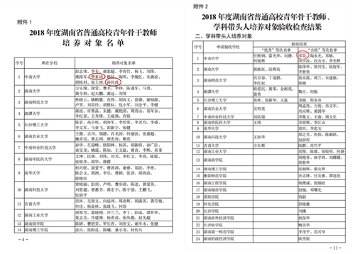 2018年12月28日,湖南省教育厅公布了2018年度湖南省普通高校青年骨干教师培养对象遴选立项和青年骨干教师、学科带头人培养对象验收检查结果。我院青年教师贾素洁、孙传政被确定为2018年度湖南省普通高校青年骨干教师培养对象,我院邓昊教授成功通过湖南省普通高校学科带头人培养对象验收检查。