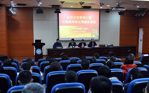 1月29日下午,何庆南书记、张国刚院长、杨飞龙副书记和党委委员、副院长黄飞舟、欧阳文、吕奔分别到后勤、医疗、教学线宣布新任文件并谈话。