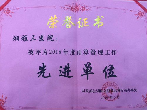 湖南省财政监察专员办事处在通报中对湘雅三医院的2018年度预算管理工作给予了充分肯定,医院在预算执行方面更加规范严格,在银行账户和资金管理方面更加规范透明,被评为2018年度7家中央驻湘预算管理工作先进单位中唯一的医疗单位。