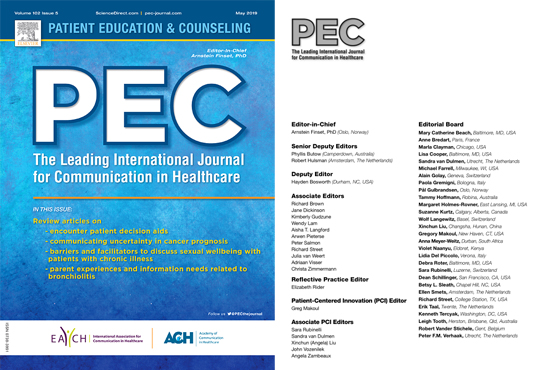 PEC办刊宗旨是探讨和阐述卫生保健教育、医疗咨询和医患沟通模式,为广大研究者提供一个理论及应用研究平台,以推动以患者为中心照护理念的发展。PEC自2017年开始筹备发行Patient-Centered Innovation(PCI)特刊,2018年底正式上线。PCI被Medline和Pubmed收录,并与PEC共同享有影响因子。PCI特刊由美国著名医患沟通学者Greg Makoul担任主编,刘新春及其他来自不同国家的4位学者担任副主编。PCI将主要关注鼓励患方参与的干预研究,包括但不仅限于以下研究:照护协调,医患沟通,医疗照护个案,医学教育,病人感受,病人/家属/照护者/社区参与,患者自我报告,远程医疗,自我照护,协商决策,等等。