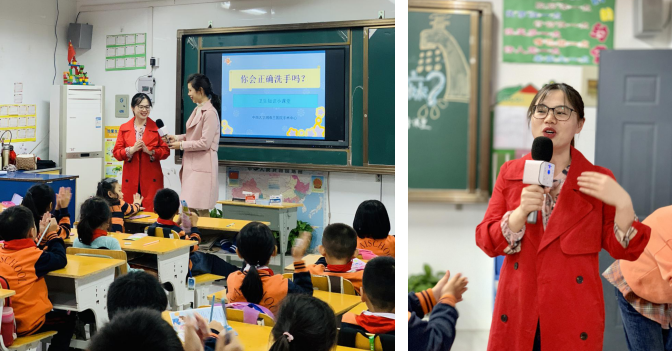 手术中心护士周恬给1804班的小朋友讲课,讲解洗手的重要性以及如何正确洗手,共同参加活动的九名护士为小朋友示范了正确的七步洗手法。为调动同学们的积极性,手术中心的护士们特地准备了小礼物组织了有奖问答,同学们积极参与,现场气氛活跃。