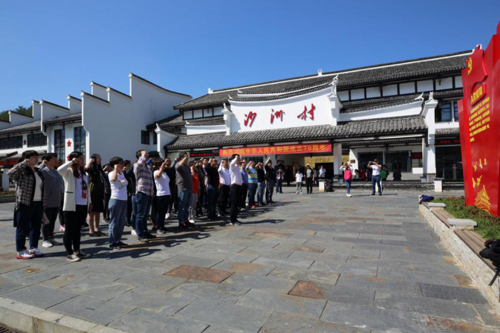 (全体党员在汝城县沙洲村陈列馆前坪广场重温入党誓词)