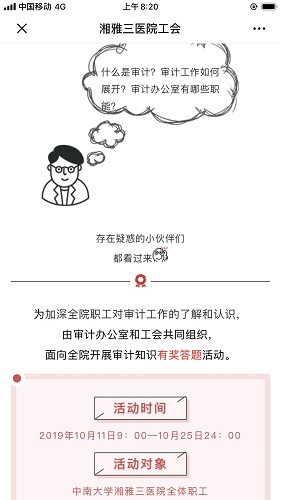 近日,湘雅三医院审计办公室联合院工会共同组织了一场为期两周的面向全院职工的审计知识竞赛线上有奖答题活动。本次答题活动旨在全院普及内部审计相关知识,激发全院职工学习内部审计法规、规章制度的热情并最终达到职工了解、支持审计工作的目的。活动采用赛中学、学中赛的方式,竞赛的内容涵盖了《中华人民共和国审计法》、《审计署关于内部审计工作的规定》及医院近期发布的三个内部审计规章制度。