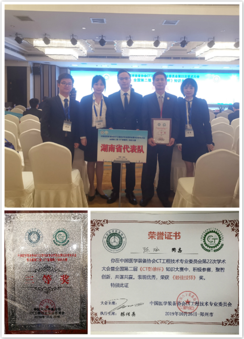 10月25日至27日,全国第二届“CT影像杯”知识大赛在河南郑州举行。湘雅三医院放射科组队代表湖南省在全国21个参赛省市代表队中获得三等奖(总分排名第五),放射科陈灿技师荣获“最佳技师”奖(本届共6名)。