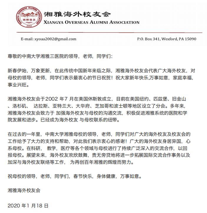 新年来临之际,湘雅海外校友会(Xiangya Overseas Alumni Association, XYOAA)向医院发来新年贺信,代表广大海外校友,向医院对海外校友们的关怀和支持表示感谢并送上新春的祝福。