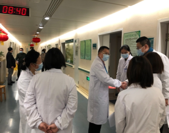 医院院长张国刚代表全体院领导来到妇科病房慰问时,热情地询问留院患者的情况并嘱咐医务人员做好自身防护,并为留院患者和医务人员送上了慰问劵和节日的问候。