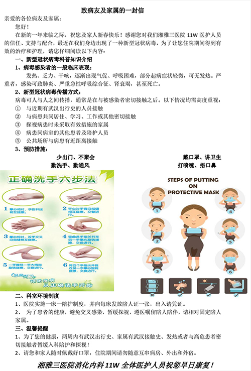有制度,更有温度。“制度”以《消化内科致病友及家属的一封信》的形式发放给患者和陪同人员。信中有新型冠状病毒科普知识介绍,包括病毒感染者的一般临床表现、新型冠状病毒传播方式以及预防措施,并明确新冠感染的新形势下,根据医院的规定和要求,消化科明细了病房防治流程,具体体现再三方面:一、收治新患者制度:收治新入院病人前,首先完善“消化内科针对住院病例新冠调查表”,表格内容简单,信息重要,可行性强。二、住院患者探访制度: 1、医院实施一床一陪护制度,并向每床发放陪人证一张,出入请凭证;2、为了患者的健康,避免交叉感染,暂缓探视,建议视频探视。特殊时期,不失人文关怀。按照医嘱留陪人陪伴,相对固定陪护家属。3、护理团队会每日为患者及家属检测体温。另建议两周内有武汉出行史、家属有武汉接触史、发热或者与高危患者密切接触者暂缓入科陪护和探视。三、病房环境管理制度:勤消毒勤通风,按照规定实施,保证患者及家属安全。