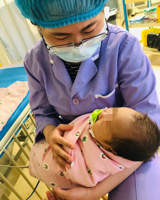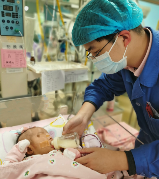 外科手术恢复期的患儿,“医生爸爸”一边细心的喂奶,一边握住他的小手给予安全感
