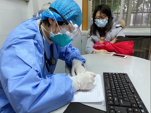 图为:一线医生李欣为患儿诊治
