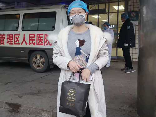 1月26日,那和工作人员将新鲜新鲜出炉的面包点心送到医务人员手中。为医务工作者鼓劲加油。