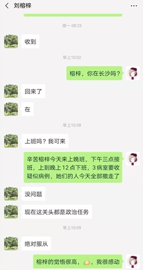 1月29日大年初五,注定又是不平凡的一天,病房需再次立即调配护理人员回科室上班。我给护士刘榕梓发了一条消息:“榕梓,你在长沙吗?”还没等我说出什么事情,刘榕梓马上回复:“护士长,我在,随时可以回来上班。”这就是我们的护士,时刻准备着奋战临床一线,时刻心系着群众的安危,这群可亲可爱可敬的人,哪是什么白衣天使,不过是一群孩子换了一身衣服,学着像前辈一样,治病救人和死神抢人罢了。