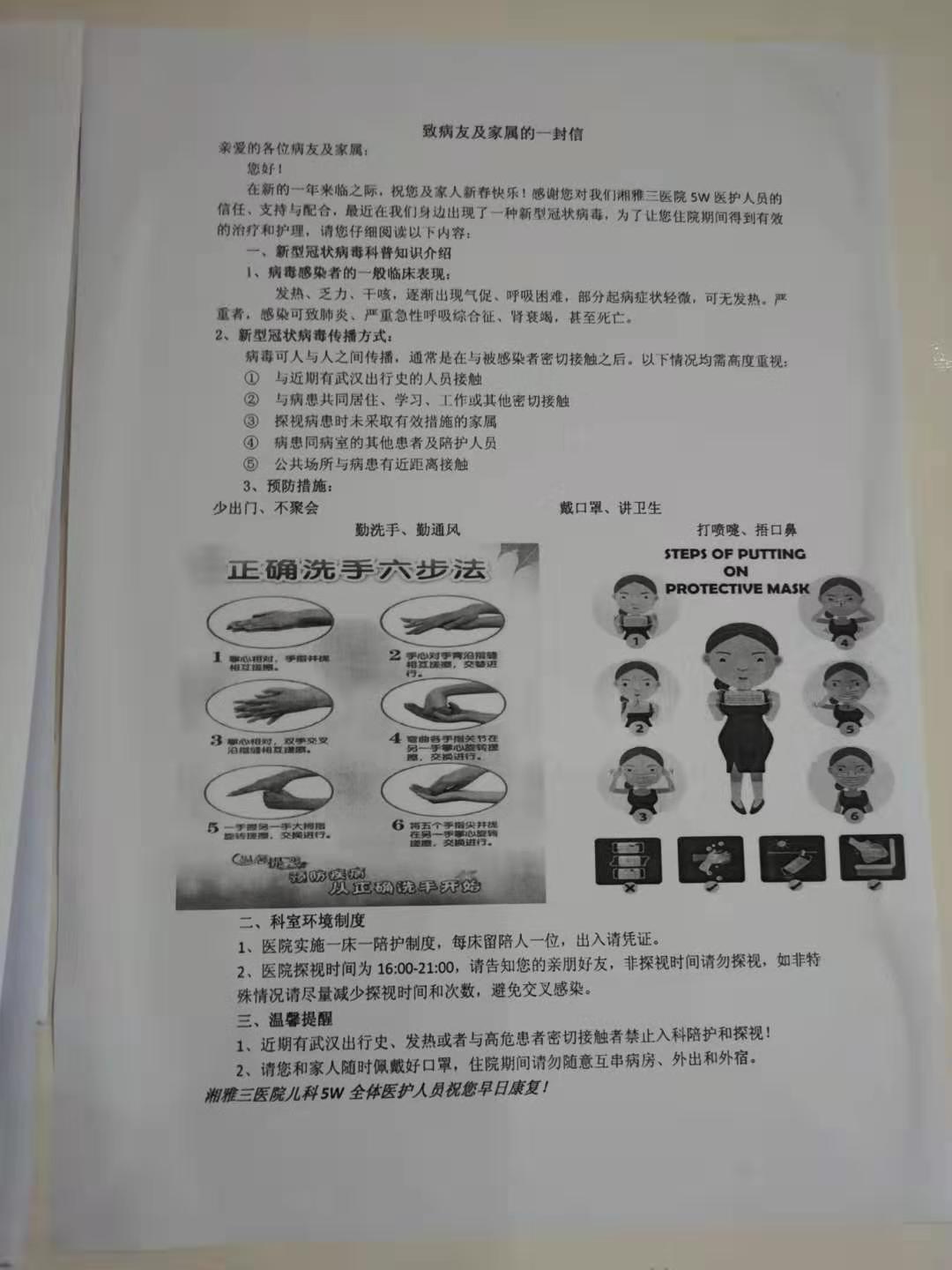 为做好病房的环境卫生,手把手指导护工阿姨如何配置正确浓度的84消毒液,并要求其严格按照标准执行。儿科肺炎发热的宝宝较多,为避免交叉感染,我们反复告知家属不能带宝宝们进出其他的病房,科室大门上也贴上了谢绝外人探视的告示,要求进出的家属们也都要配合工作人员做好信息登记以及测量体温,家属们纷纷表示理解并积极配合。除此之外,我们还积极指导家属应如何选择正确的口罩,如何正确的佩戴口罩,以及家长应如何做好儿童的防护。