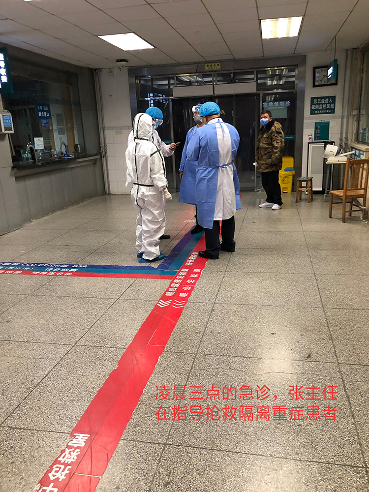 每一场战斗,都需要一位领军大帅,每一次成功,都离不开领军大帅的运筹帷幄。急诊科主任张天一,便是我们急诊科的军帅。从年前的应急准备到年后的严防死守,从白天的岗位巡视到半夜的紧急处理,从一楼诊室、抢救室到二楼留观室、EICU,时时处处都有张天一刚健的身影,如泰山坐镇,稳稳妥妥迎接病魔一次又一次的冲击。大年三十,张主任放弃和家人团聚以科室为家,从早到晚坚守科室指挥工作;凌晨三点,有新冠肺炎疑似重症患者就诊,张主任毫不犹豫驱车直赶到科室,亲临现场疏通抢救通道;得知医院增派应急护士支援急诊科,张主任为大家加油鼓劲,共勤共勉;了解到春节假期食堂关门,他为大家安排好每日饭菜让全科室在岗医护人员吃得放心;观察到有医生为繁忙的医疗所累,张主任主动和医生谈心缓解心理压力;见急诊内科医师全员上阵都捉襟见肘,他统筹大局协调急诊外科支援......张主任给了急诊科医护最大最稳的依靠。