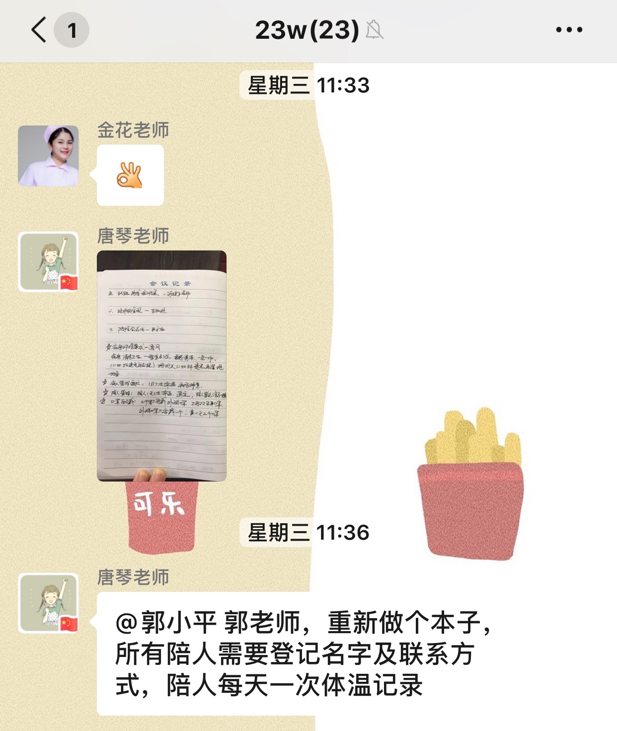 产科全体医护人员极度重视对病区环境的安全保障,对整个病房进行了反复全面的消毒整顿和卫生督查。为做好病房的管理,护士长唐琴和副护士长何海玉整个春节期间都值守在病房,并且手把手指导护工阿姨如何配置正确浓度的84消毒液,要求其严格按照标准执行。病房严格限制陪人,要求必须有陪人证方可进入产科病房并且登记姓名和联系方式。医护人员每天定时监测孕产妇、新生儿及家属的体温。