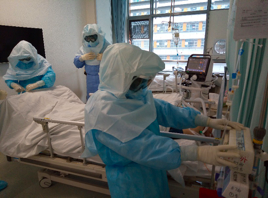治疗小组的医务人员一直都在密切地关注这位患者的病情变化,考虑到患者情况十分危急,张强医生主动请缨说:“我立刻前去协助!”于是,本来正在酒店休息的张强医生于晚上11点左右赶到病房,立刻进入隔离病房协助处理该患者。考虑到患者的呼吸衰竭可能伴有循环障碍,张强医生在隔离病房全副武装的情况下,给患者做了深静脉穿刺置管,加速补液以维持循环。